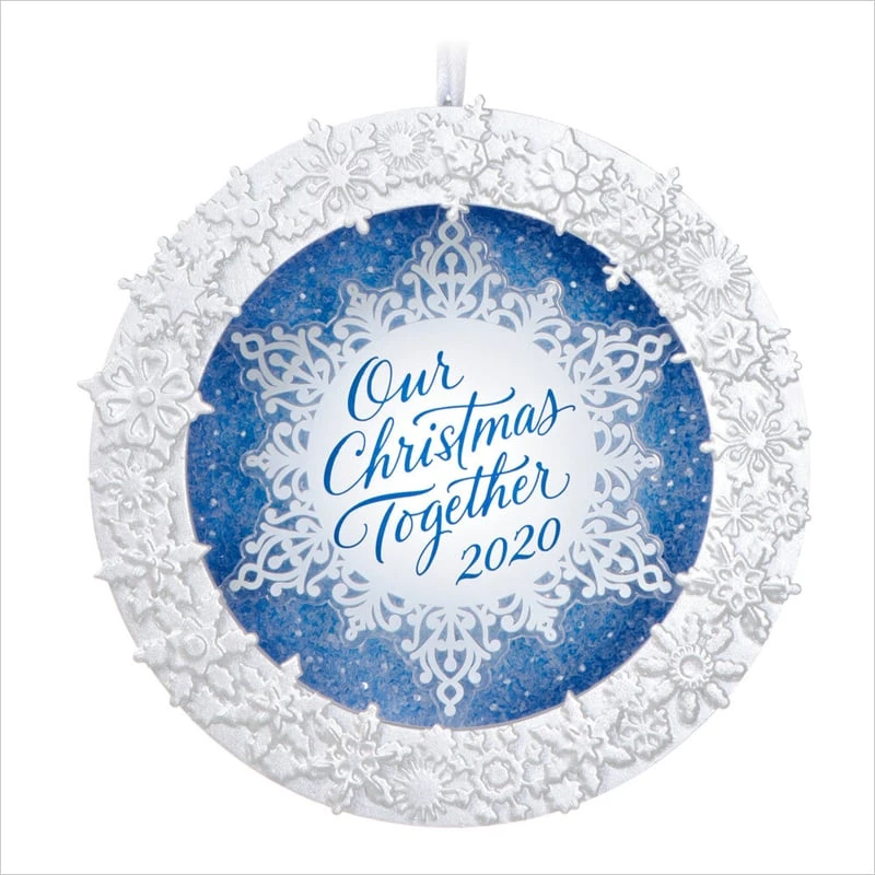 Share the warmth of the season with the one you love. This elegantly rounded Christmas tree ornament features a glittery snowflake border surrounding an “Our Christmas Together 2020” message. Insert the bulb of a standard miniature light string through the rubber grommet on the ornament to add a special glowing effect for a lifetime of memories.