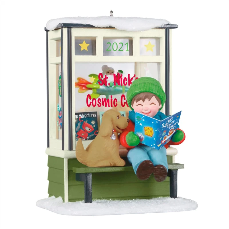 Nothing warms the heart quite like the enthusiasm of a child enjoying a new story, which is exactly what Keepsake Artist Tammy Haddix delivers for the 19th ornament in the Christmas Window collector’s series. This smiling little boy could hardly wait to get outside before diving into the latest adventure of “Rylan’s Space Shuttle.” His cute puppy dog sits on the bench next to him, sharing the excitement of a successful trip to St. Nick’s Cosmic Comics shop. Glistening with glittery snow accents, this KOC member exclusive Christmas tree ornament is sure to brighten your holidays.