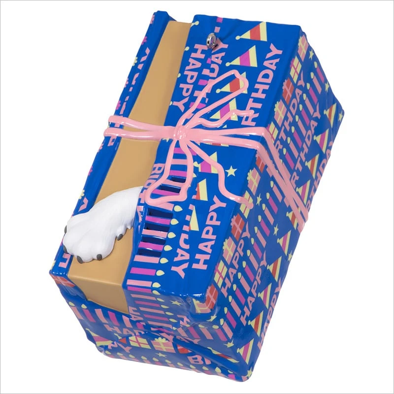 Aunt Bethany means well, even if she does sometimes get confused and forgetful. Relive the hilarious scene from the classic holiday movie “National Lampoon’s Christmas Vacation” when Clark, Ellen and Rusty discover that Aunt Bethany wrapped her cat as a present. Watch the box vibrate and hear cat sounds when you press the button on this Christmas tree ornament (battery-operated).