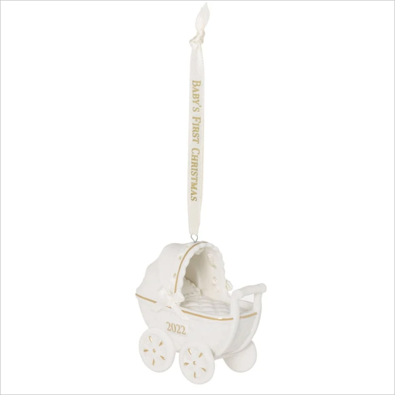 You’ll always remember your baby’s first Christmas. This sweet Christmas tree ornament features a porcelain baby carriage embellished with metallic gold accents and “2022.” The satin ribbon hanger includes a “Baby’s First Christmas” message printed in gold ink to commemorate this special time for your family.