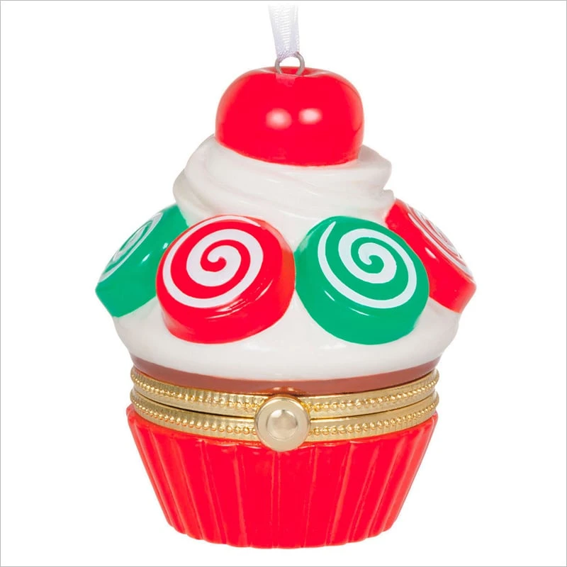 Share a sweet treat with this special edition Christmas Cupcakes porcelain Christmas tree ornament. Cupcake-shaped trinket box decoration opens at the metal clasp to hide a tiny treasure inside. Painted with a tasty-looking design of red and green swirled candies, white frosting and a cherry on top, this pretty ornament is the perfect addition to your Christmas Cupcakes series.