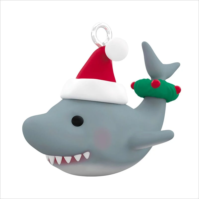 Whether your winter weather forecast calls for snow or balmy temperatures over the holidays, you can make it a great, white Christmas with this great white shark Christmas tree ornament! The fun and festive miniature design features a smiling shark decked out in a Santa hat with a wreath around its tail fin.