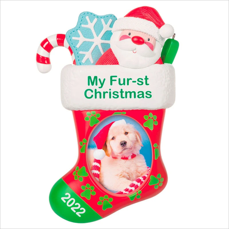 Celebrate a beloved pet’s first Christmas with this adorable stocking-shaped photo holder Christmas tree ornament. Frame features a paw print pattern and is stuffed with festive toys. Add a small snapshot of your favorite puppy or kitten as a special memory for years to come. Year dated 2022.
