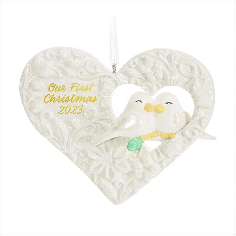 Give them a gift to have and to hold for years to come. This beautiful porcelain heart Christmas tree ornament features ornate embossed detailing with a pair of white doves perched in a heart-shaped opening. Year-dated 2023, it’s an especially lovely keepsake for newlyweds or any new couple.